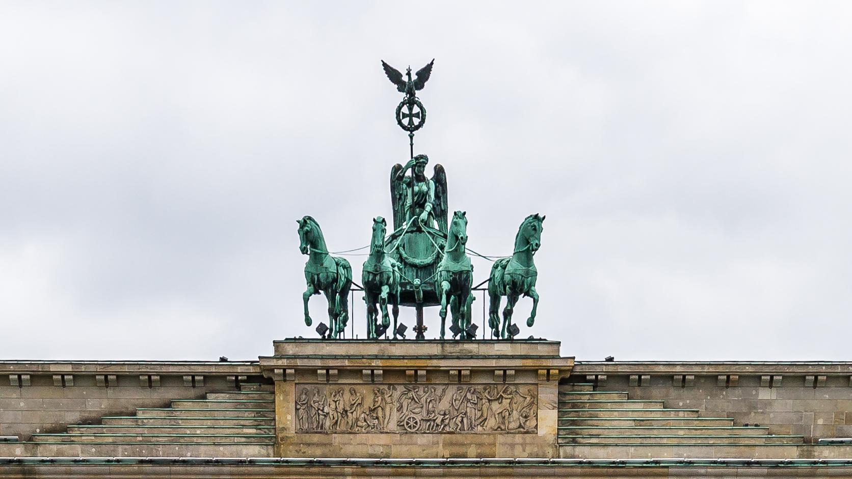 - Elle est surmontée par un quadrige et la déesse ailée de la victoire. Cette déesse, fut confisquée par Napoléon, lorsqu’il vainquit les prussiens en 1806, puis récupérée par eux en 1815.