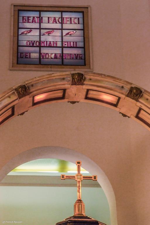 De forme octogonale, l’église porte sur chacun de ses murs l’inscription de l’une des huit béatitudes proclamées et enseignées par Jésus (Matthieu 5.1-16) :