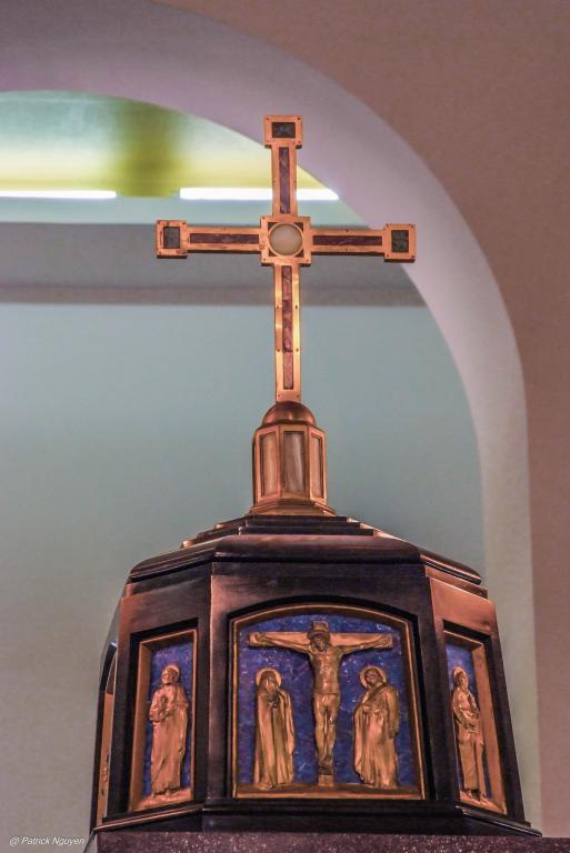 Devant l’église, les symboles sur les pavés représentent la Justice, la Prudence, la Force, la Charité, la Foi et la Tempérance. Le manteau porté par le Pape Paul VI lors de sa visite de 1964 est accroché dans l’église.