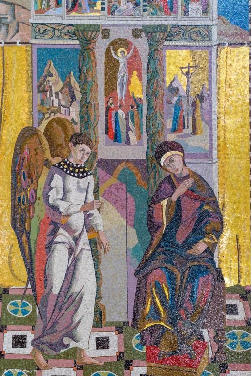 A l’intérieur de la basilique se trouve, au niveau inférieur, la grotte de l’Annonciation. L’archange Gabriel y annonça à Marie qu’elle enfanterait le fils de Dieu, Jésus (qui signifie Dieu sauve en hébreu), qu’elle appellerait Emmanuel (qui signifie Dieu avec nous).