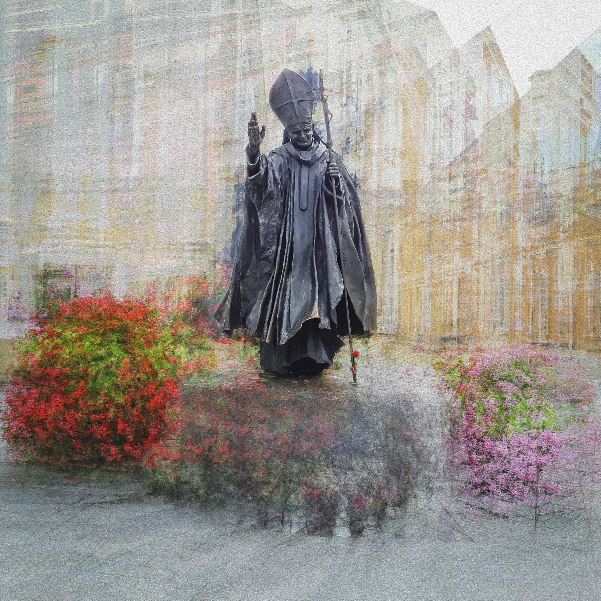 Voici un exemple de photo impressionniste où le sujet est la statue de Jean Paul 2 à Wadovice (Pologne), sa ville natale : la photo semble irréelle avec la statue nette et le reste plongé dans un flou artistique.